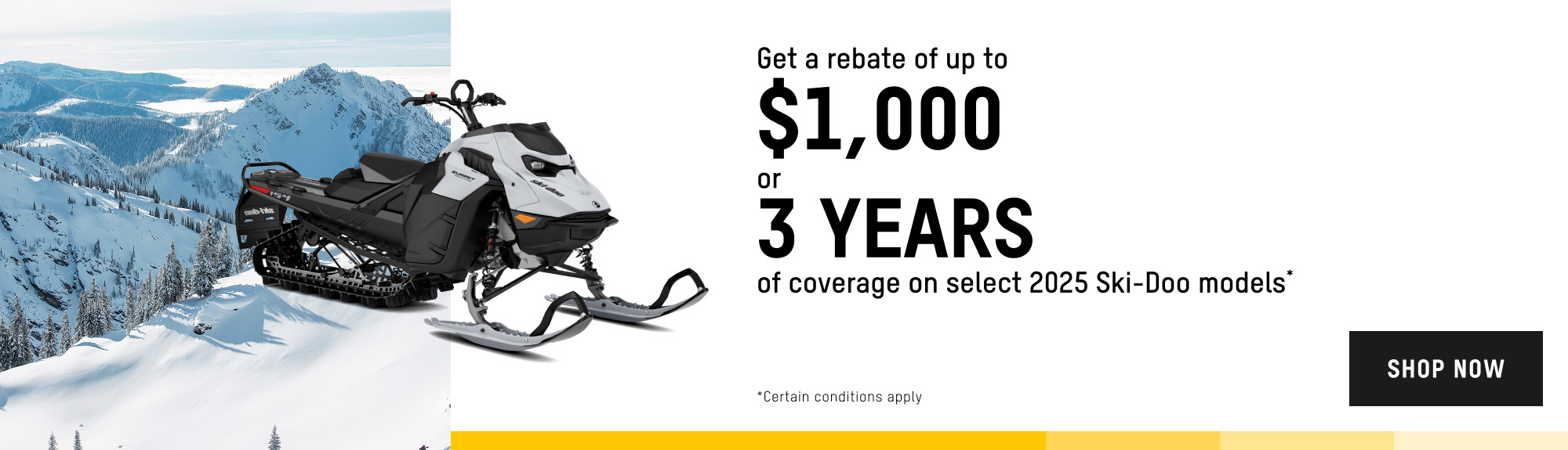 † $1,000 rebate on 2025 Full-Sized Ski-Doo and Lynx models: Consumers who purchase an eligible model during the promotional period are eligible to a $1,000 rebate.